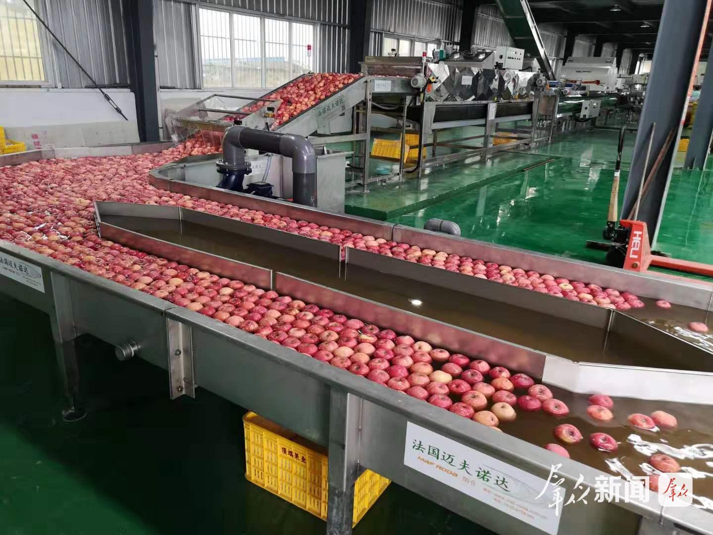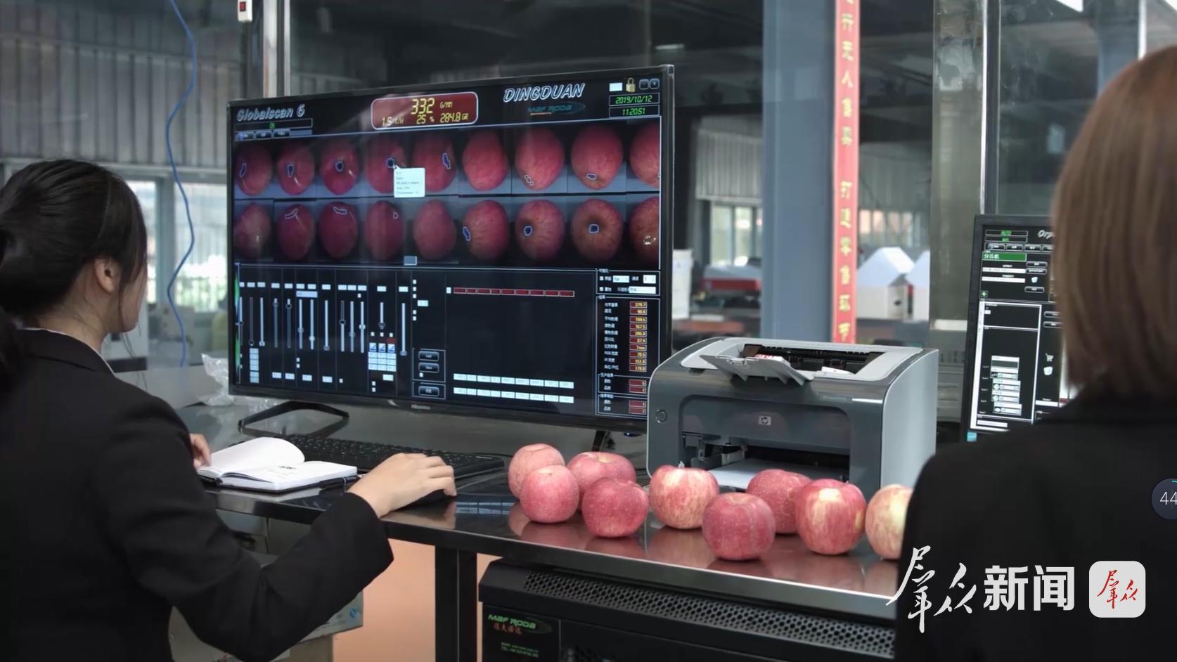 “我們要保證消費(fèi)者吃到的蘋果口感一致、品質(zhì)一致?!表敹斯麡I(yè)銷售總監(jiān)趙鋒鋒站在選果線旁,看著蘋果按等級(jí)分到不同通道。公司平均每天分選40噸蘋果,發(fā)貨5000到6000箱,精準(zhǔn)分選后,能省下30%的人力。