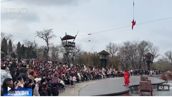 在河南開封的萬歲山武俠城景區(qū),穿著戲服在臺上斷案的并不是演員,而是現(xiàn)場選取的游客。在這里,從街頭到巷尾,風格各異的演員帶著游客猜拳、破案、比武功,甚至一起走入劇情演繹角色。通過參與互動,游客還能賺取“銀票”在景區(qū)購物,沉浸體驗古代市井生活。景區(qū)里戰(zhàn)馬奔騰、云梯攻城等實景演出輪番上演。
