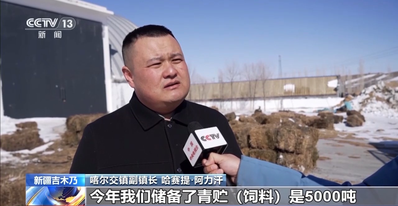 喀爾交鎮(zhèn)副鎮(zhèn)長(zhǎng)哈賽提·阿力汗:今年我們儲(chǔ)備了青貯飼料5000噸,干草10000包,這樣群眾就可以在家門口就近購(gòu)買運(yùn)輸飼草料,解決他們?cè)诙撅暡萘隙倘狈矫娴睦щy。