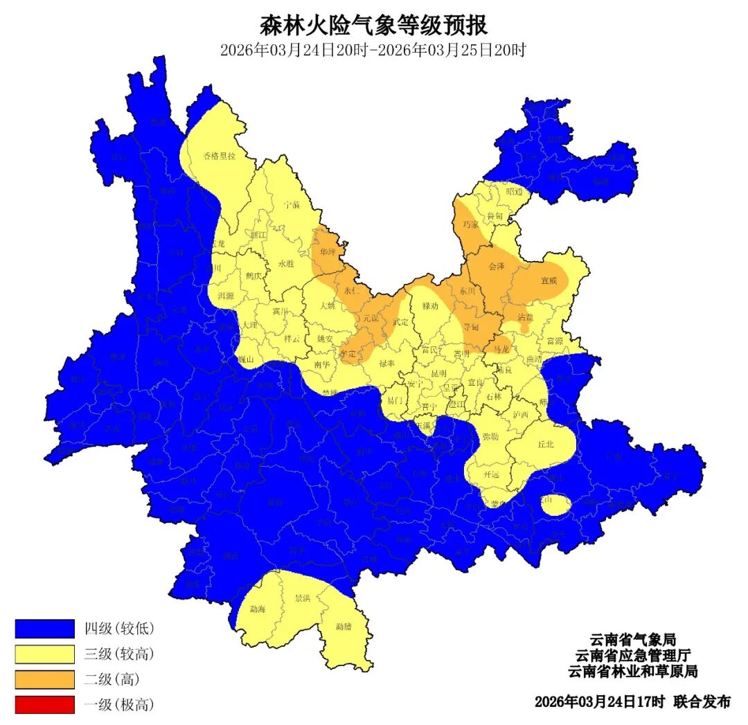 2026年3月24日20時(shí)至3月25日20時(shí),麗江市東部、楚雄州北部、昆明市東北部、昭通市西南部、曲靖市北部二級(jí)(高),迪慶州東部、麗江市中部、大理州北部和東部、西雙版納州、楚雄州中部、昆明市大部、玉溪市北部、昭通市南部、曲靖市中部、紅河州北部、文山州西北部三級(jí)(較高),其他地區(qū)四級(jí)(較低)。
