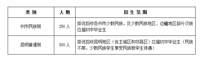 根據云南省教育廳和云南省民宗委文件要求,2021年學校計劃招生570人,其中面向昆明市招收高一新生300人(含主城區(qū)和郊縣區(qū)),面向全?。êッ鞯貐^(qū))招收藝體特長生20人(具有聲樂、民樂、足球專長的學生經過專業(yè)考核合格,可降20分錄取)。