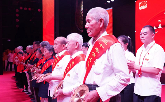 文藝匯中,關(guān)上社區(qū)舉行了“光榮在黨50年”紀(jì)念章頒發(fā)儀式,該社區(qū)21位“光榮在黨50年”老黨員代表領(lǐng)取了紀(jì)念章。據(jù)了解,21位50年以上黨齡的老黨員中,黨齡最長的67年,最短的50年,有社區(qū)居民、退休工人、退伍軍人等,當(dāng)天還表彰了社區(qū)2020年第二屆全國最美家庭艾慶瑋同志。