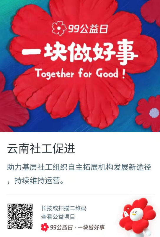 該項(xiàng)目的發(fā)起,旨在支持云南省社工事業(yè)發(fā)展,提高社會工作者專業(yè)服務(wù)水平,減輕他們的工作壓力,為沒有公募資格基層社工機(jī)構(gòu)分享公募權(quán),可以通過網(wǎng)絡(luò)平臺,開展人道資源動員,提升網(wǎng)絡(luò)籌資經(jīng)驗(yàn),推動自籌經(jīng)費(fèi)開展項(xiàng)目,發(fā)掘社工機(jī)構(gòu)發(fā)展的新途徑,用優(yōu)質(zhì)的服務(wù)基層易受損人群,共同助力鄉(xiāng)村振興。
