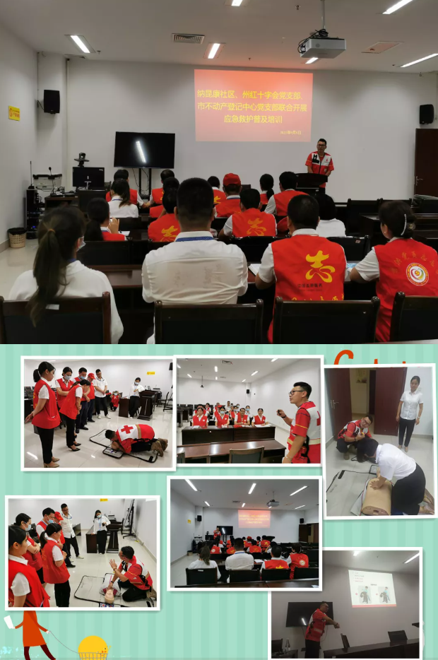 進(jìn)單位駐地社區(qū)開展應(yīng)急救護(hù)培訓(xùn)。結(jié)合黨史學(xué)習(xí)教育“我為群眾辦實(shí)事”實(shí)踐活動,為推進(jìn)“雙報到雙服務(wù)雙報告”工作走深走實(shí),圍繞“群眾需要什么、我們能做什么”,9月6日下午,省紅十字會機(jī)關(guān)與昆明市官渡區(qū)關(guān)上中心區(qū)社區(qū)聯(lián)合開展“應(yīng)急救護(hù)知識普及培訓(xùn)進(jìn)社區(qū)”志愿服務(wù)活動,省紅十字會黨組書記董和春、副會長張成文以及部分黨員干部參加活動。社區(qū)轄區(qū)內(nèi)云南林業(yè)規(guī)劃院昆明分院、官渡區(qū)農(nóng)村合作銀行、官渡區(qū)教師進(jìn)修學(xué)校、昆明市公安局官渡分局經(jīng)偵大隊(duì)、昆明市公安局交通警察支隊(duì)第三大隊(duì)、官渡區(qū)幼兒園等6個單位約40名黨員參加培訓(xùn)。