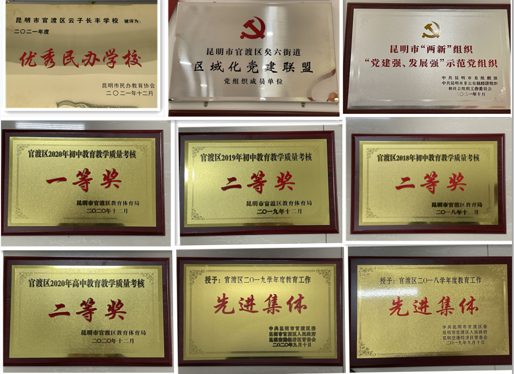 2018年被官渡區(qū)教育局授予2018年初中教育教學(xué)質(zhì)量考核二等獎(jiǎng);2019年被官渡區(qū)教育局體育局授予2019年初中教育教學(xué)質(zhì)量考核二等獎(jiǎng);2020年被官渡區(qū)教育局體育局授予2020年初中教育教學(xué)質(zhì)量考核一等獎(jiǎng);2020年被官渡區(qū)教育局體育局授予2020年高中教育教學(xué)質(zhì)量考核二等獎(jiǎng);2019年被官渡區(qū)區(qū)委區(qū)政府授予官渡區(qū)2018年度教育工作先進(jìn)集體;2019年被官渡區(qū)區(qū)委區(qū)政府授予官渡區(qū)2019年度教育工作先進(jìn)集體;2019年被中共昆明市委組織部命名為“五星級”示范黨支部;2019年被中共昆明市委組織部評為昆明市基層黨建示范支部;