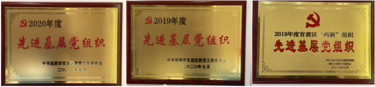 2019年被中共官渡區(qū)教育工作委員會(huì)評為“2018年度先進(jìn)黨組織”; 2019年被中共官渡區(qū)非公有制經(jīng)濟(jì)組織和社會(huì)組織工作委員會(huì)評為“2018年度官渡區(qū)兩新組織先進(jìn)基層黨組織”;2020年被中共官渡區(qū)教育工作委員會(huì)評為“2019年度先進(jìn)黨組織”;2021年被中共官渡區(qū)教育工作委員會(huì)評為“2020年度先進(jìn)黨組織”;2022年被中共官渡區(qū)教育工作委員會(huì)評為“2021年度先進(jìn)黨組織”;2021年被昆明市“兩新”組織評為“黨建強(qiáng)、發(fā)展強(qiáng)”示范黨組織;2021年被昆明市民辦教育協(xié)會(huì)推薦評選為昆明市優(yōu)秀民辦學(xué)校。