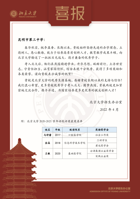 在學(xué)校師生的共同努力下,學(xué)校高考上線率和重點(diǎn)率一直保持全省領(lǐng)先水平。近年來,高考總上線率均為100%,學(xué)校一本率穩(wěn)定在90%左右,一大批同學(xué)考入清華大學(xué)、北京大學(xué)、南開大學(xué)、復(fù)旦大學(xué)等知名大學(xué)學(xué)習(xí)。多年來,昆明市第三中學(xué)連續(xù)榮獲“省高中教育教學(xué)質(zhì)量一等獎(jiǎng)”獎(jiǎng)勵(lì)。此外,學(xué)校各學(xué)科競賽和文藝、體育競賽的成績也十分顯著,辦學(xué)效益得到社會(huì)的廣泛認(rèn)可,成為優(yōu)質(zhì)教育資源的代名詞。