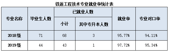 專業(yè)辦學(xué)多年,就業(yè)形勢(shì)良好,每屆畢業(yè)生中,主要就業(yè)單位為國(guó)鐵、地鐵、中鐵等系統(tǒng)的大型國(guó)企、央企。2018屆畢業(yè)生就業(yè)率達(dá)95.77%(專業(yè)對(duì)口就業(yè)率達(dá)94.11%)以上;2019屆畢業(yè)生就業(yè)率達(dá)97.72%(專業(yè)對(duì)口就業(yè)率達(dá)95.34%)。