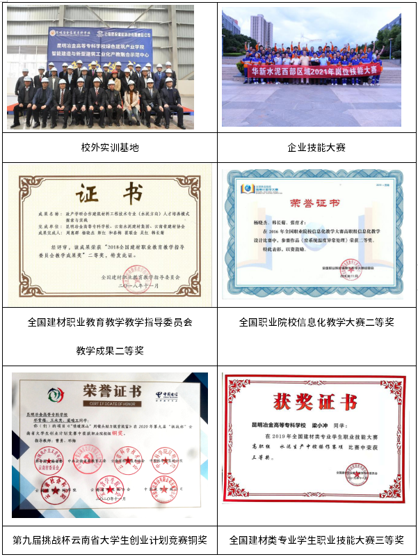 教學(xué)團隊為省級教學(xué)團隊。專職教師21人,其中教授3人、副教授8人,博士1人、碩士13人,“雙師型”教師20人,云南建材職業(yè)教育教學(xué)指導(dǎo)委員主任委員、副主任委員3人。團隊成員主持完成國家教學(xué)資源庫建筑材料工程技術(shù)專業(yè)子項目建設(shè)1項,國家專業(yè)教學(xué)標(biāo)準(zhǔn)3項,省級精品課程3門。教師獲全國教師信息化教學(xué)大賽二等獎1項,全國教師教學(xué)能力大賽三等獎1項。