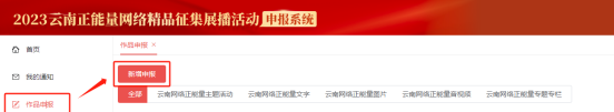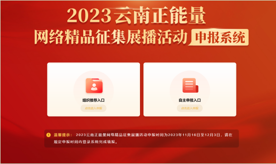 2023云南正能量網(wǎng)絡(luò)精品征集展播活動的申報時間為2023年11月16日至12月3日。申報采用組織推薦和自主申報兩種方式進行。兩種申報方式均可通過登錄網(wǎng)頁wgyb.qicaiyunan.cn進行線上申報。