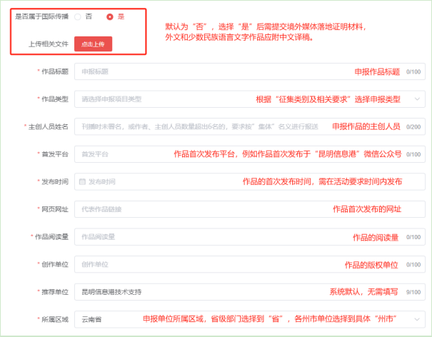 作品標題、申報類型、主創(chuàng)人員姓名、作品首發(fā)平臺、發(fā)布時間、作品網(wǎng)址(音視頻和專題專欄需附上二維碼)、作品閱讀量、創(chuàng)作單位、推薦單位、所屬區(qū)域?!皣H傳播作品”在頁面選擇“是”后需提交落地證明材料,外文和少數(shù)民族語言文字作品應附中文譯稿,不得改寫或超出原文內(nèi)容。選擇填報說明如下: