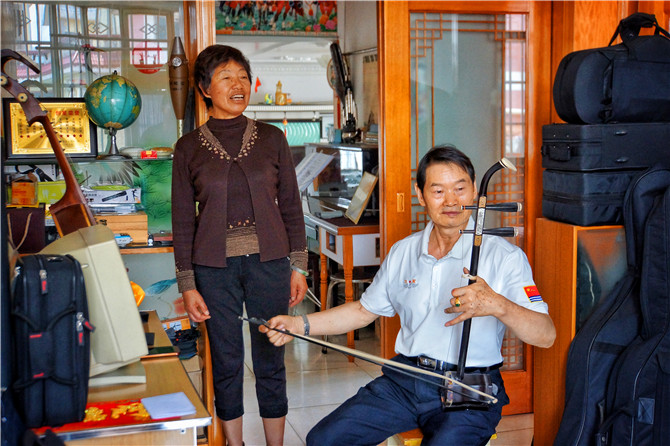 劉俊家有三十多件樂器,他幾乎都會一點。七十年代,村子里文化生活單一,有樣板戲看已經(jīng)很不錯;那時他二十歲出頭,在花燈團拉二胡。如今,他已70歲,在老年大學教二胡。[詳情]