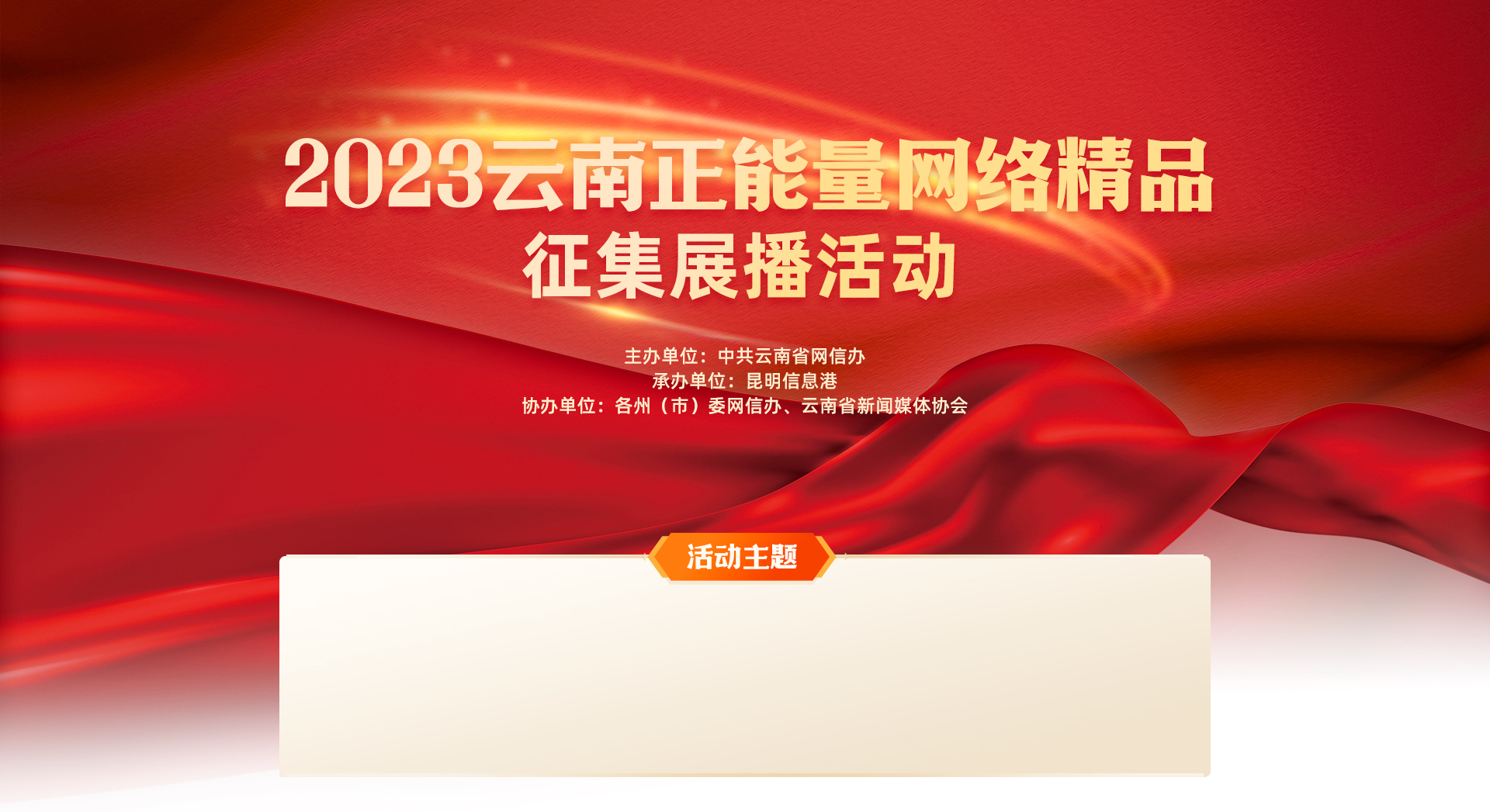 2023云南正能量網(wǎng)絡(luò)精品征集展播活動(dòng)以習(xí)近平新時(shí)代中國(guó)特色社會(huì)主義思想特別是習(xí)近平總書記關(guān)于網(wǎng)絡(luò)強(qiáng)國(guó)的重要思想為指導(dǎo),以學(xué)習(xí)宣傳貫徹黨的二十大精神為主線,圍繞經(jīng)濟(jì)發(fā)展“強(qiáng)信心”宣傳、踐行社會(huì)主義核心價(jià)值觀、弘揚(yáng)中華優(yōu)秀傳統(tǒng)文化、“一帶一路”倡議提出十周年、“有一種叫云南的生活”等重大主題,聚焦我省高質(zhì)量發(fā)展、民族團(tuán)結(jié)、生態(tài)保護(hù)、對(duì)外開放等具體實(shí)踐,征集展播一批網(wǎng)民認(rèn)可、社會(huì)認(rèn)同、影響廣泛的網(wǎng)絡(luò)正能量作品,充分發(fā)揮正能量激勵(lì)人、鼓舞人、引領(lǐng)人的重要作用,以澎湃昂揚(yáng)的正能量激勵(lì)各族干部群眾奮力譜寫中國(guó)式現(xiàn)代化的云南篇章。