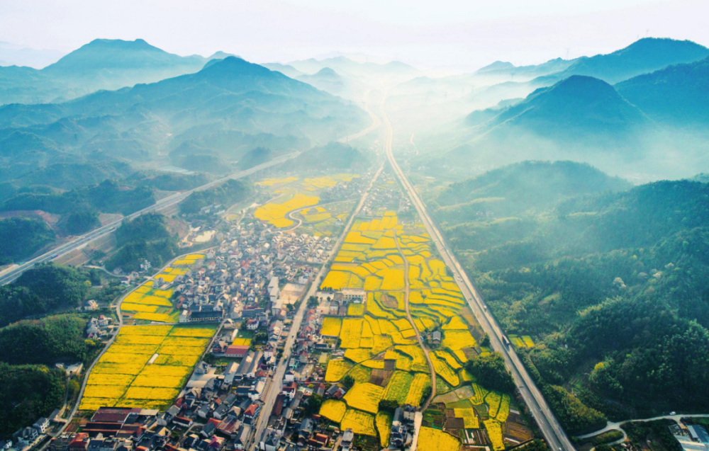 在浙江省杭州市臨安區(qū)天目山鎮(zhèn)橫塘村,油菜花田與村莊、公路、群山構(gòu)成一幅美麗畫卷(2025年4月2日攝)胡劍歡攝