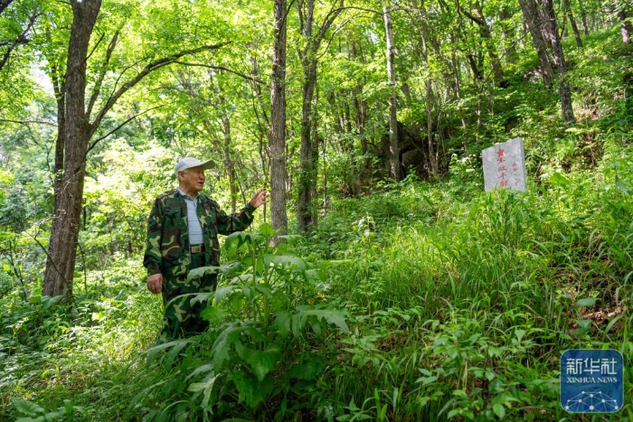 ??↑ 6月17日,在七星砬子抗聯(lián)密營遺址內,集賢縣革命老區(qū)建設促進會會長樸永鶴介紹抗聯(lián)十一軍軍政干部學校遺址。